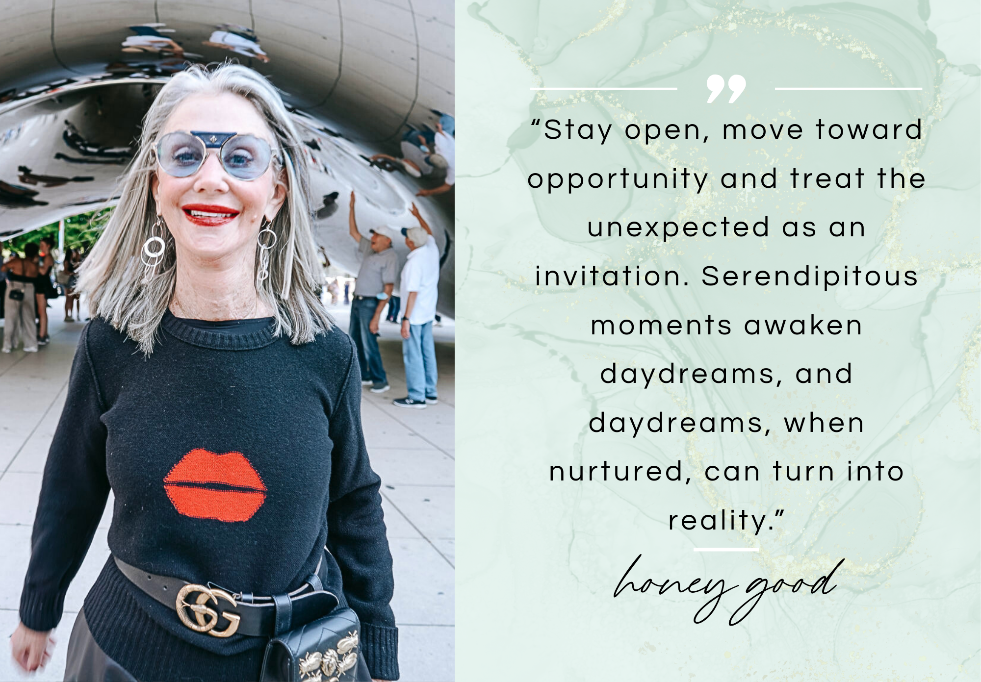 Serendipitous moments awaken daydreams, and daydreams, when nurtured, can turn into reality. Life becomes a glorious adventure when you stop waiting for luck and start creating the conditions for it to find you. I know because I have that ability. I am Madame Serendipity to my core.
